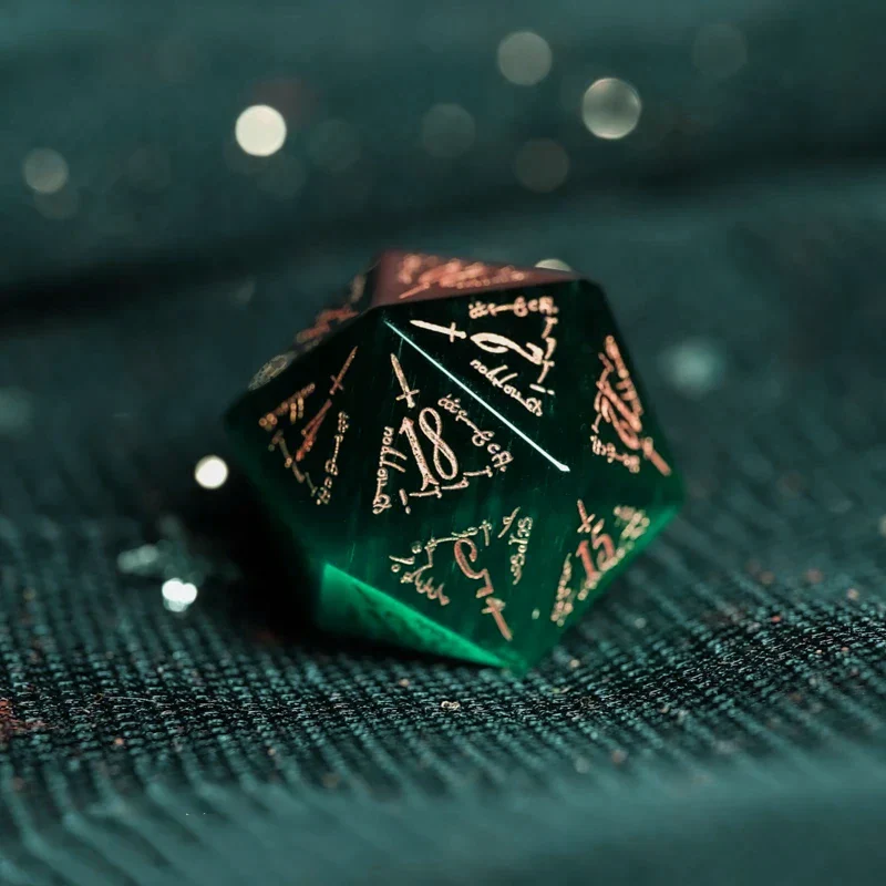 Midnight Seer · Emerald Cat’s Eye Engraved Gemstone Dice Set